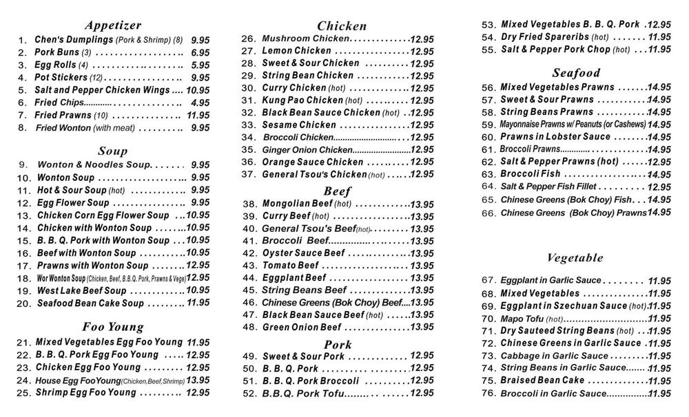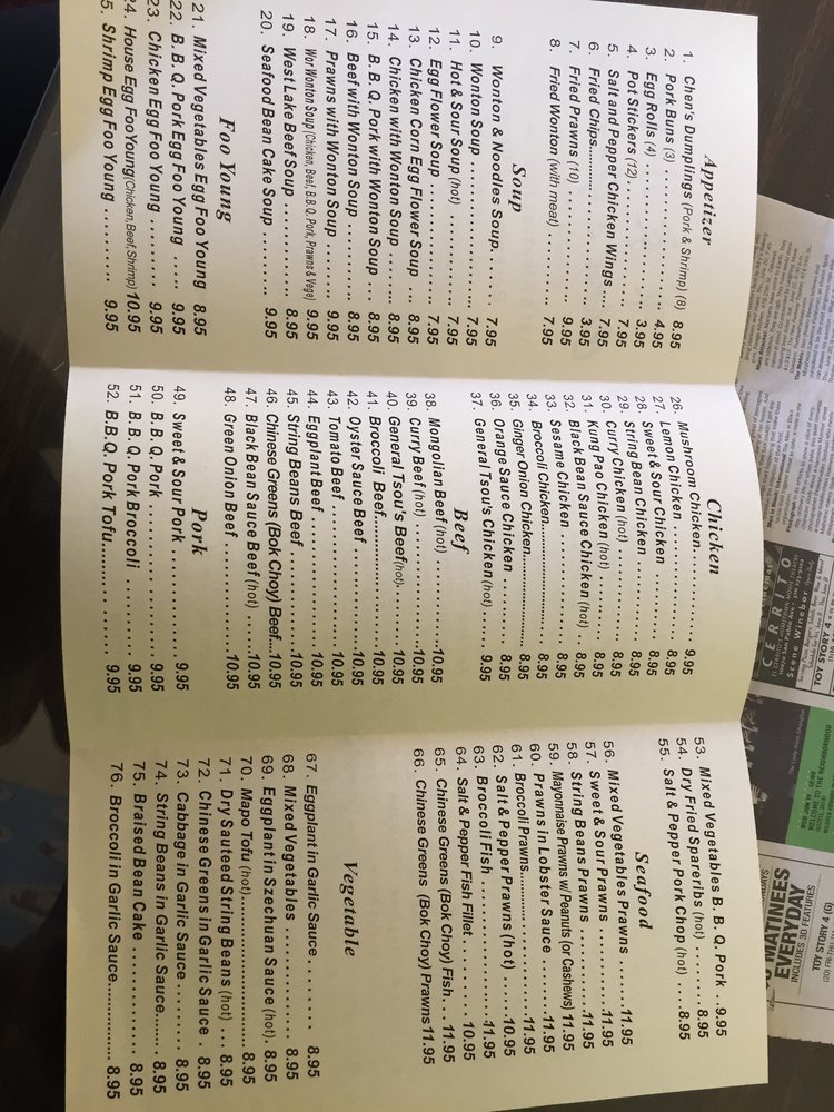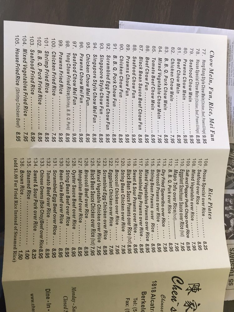 Introducing Chen’s Garden, a Chinese restaurant located in Berkeley, CA, offering a wide range of menu options. From flavorful appetizers like Chen's Dumplings and Pork Buns to satisfying soups like Hot and Sour Soup and West Lake Beef Soup, every dish is thoughtfully prepared. Don't miss out on their signature dishes like the Salt and Pepper Chicken Wings and the House Egg Foo Young, showcasing authentic flavors and generous portion sizes. Customers rave about the quality and consistency of the food, with reviews highlighting favorites like the BBQ Pork and Kung Pao Chicken. With a welcoming atmosphere and attentive service, Chen’s Garden is a must-try for anyone craving delicious Chinese cuisine. Experience the delicious offerings of Chen’s Garden for yourself and discover why it's a go-to spot for authentic Chinese food.
